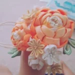絹素材は光沢や肌ざわりが素晴らしく、出来上がりに品をプラスしてくれる。着物にはさみを入れる事は、作った職人さんに申し訳なく感じて勇気がいるが、着てもらえず丸めて売り場におかれているのは可哀想。四角く刻まれ、つままれ、糊に浸されたけれど、生まれ変わってかんざしや花束、インテリアになった姿もまた格別に良いと思う。着物を作ってくれた職人さんのためにも布の色柄、素材を生かした作品作りを目指したい。